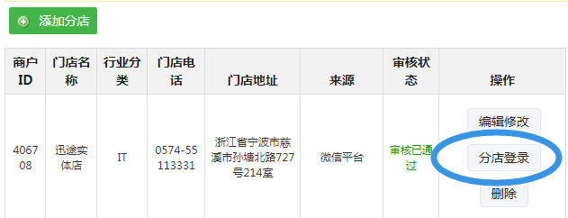 四、当分店添加后,便可以看到分店列表了,在操作项目中,点击分店登录就可以看到分店登录的网址了。(下图)
