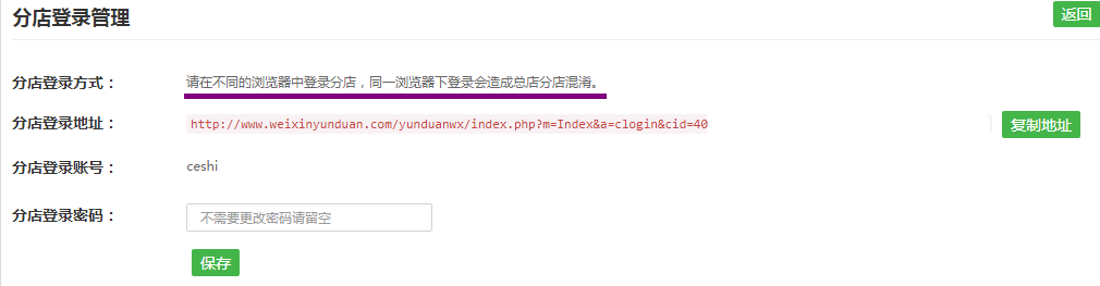 五、在分店管理中,可以看到分店登录地址,以及登录账号,店家也可以设置分店的登录密码,需要注意的是如果您需要同时登录分店或多个分店,必须用不同的浏览器打开登录地址,同一个浏览器下登录门店会造成门店ID混淆。(下图)
