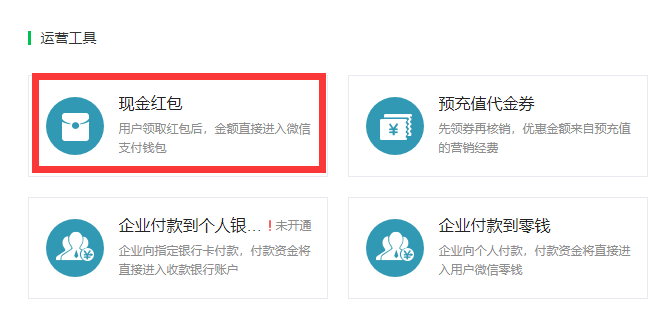 二、在产品中心里,找到”现金红包“这个运营工具,进入后首先是需要开启这个产品。