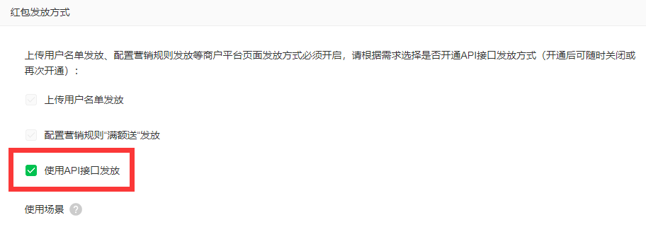 五、在修改页面,红包发放方式中,“使用API接口发放”这一项中打上勾。