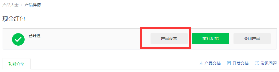三、开通现金红包这个工具后,找到”产品设置“这一项,点击进入设置。