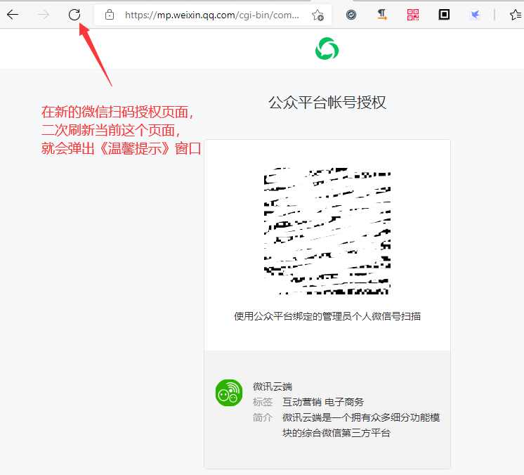一;在新的微信扫码授权页面下,二(多)次刷新当前这个页面,就会弹出《温馨提示》窗口。