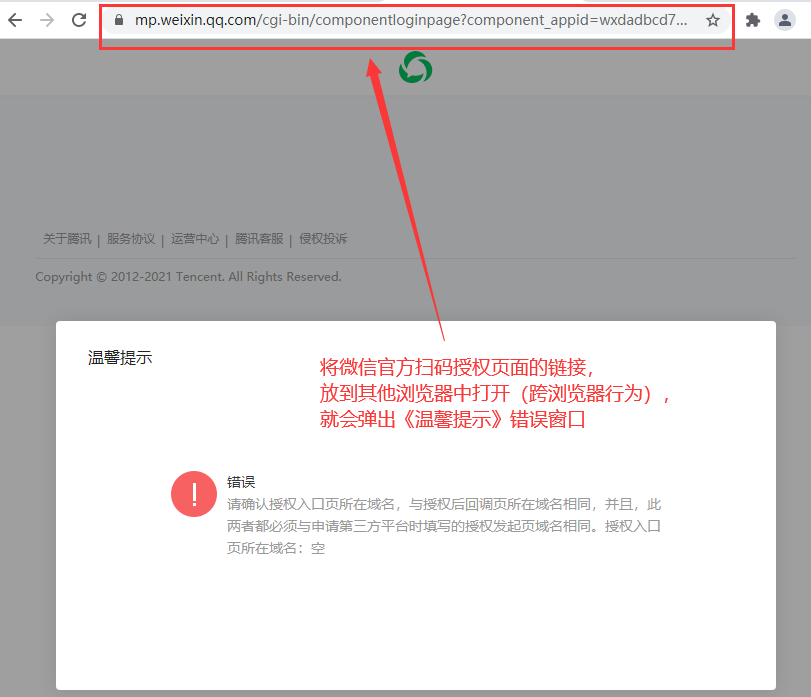 二;将微信扫码授权页面的链接地址放到其他的浏览器中打开(跨浏览器行为)的操作,就会弹出《温馨提示》的窗口。
