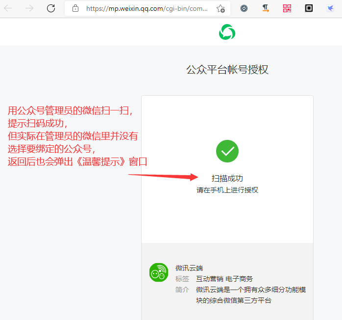 三;用公众号管理员微信扫一扫成功后,但实际在管理员微信中并没有选择要绑定的公众号,返回后就会弹出《温馨提示》的窗口。