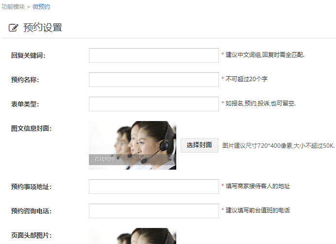 在软盈后台首页点击“功能模块”图标进入功能列表页面,找到您想使用的功能模块。这里以表单类免费功能微预约为例,我们在功能列表内找到微预约然后进入该功能页面,可以看到添加预约活动的按钮,点击添加即可进入到预约创建页面,按页面提示要求完成内容的填写,保存后就得到了一个预约活动。如图: