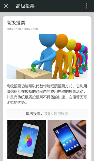 高级投票功能可以实现公众号在线投票活动,公众号商家可以添加不限数量的投票选项供粉丝参与投票,同时投票选项也可以以文字或图片方式进行。参与投票者每人最多只能投票一次,高级投票不支持多人多天多次投票。若需要多人多天多次投票,推荐使用超级投票功能。