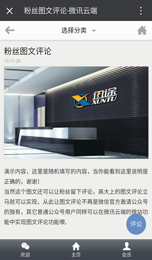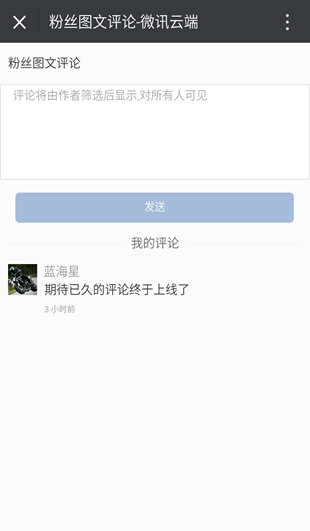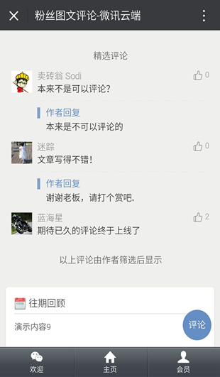 粉丝图文评论是整合于微站功能之中的文章评论模块,由于微信官方只对知名、大V、媒体、自媒体等公众号邀请开放了图文粉丝评论功能,但其它普通公众号用户是无法使用官方图文评论功能。现在软盈正式推送图文评论功能。不论公众号是普通商家、个人、传媒、组织,企业,还是知名公众号等,现在一律可以通过微站功能的图文评论模块,可以轻松实现粉丝对于公众号作者的图文内容评论,支持公众号作者后台审核粉丝评论内容,通过审核后粉丝发表的评论才会被显示到手机端的图文内容页中,同样我们鼓励所有用户能为粉丝提供优质而原创的公众号文章内容。