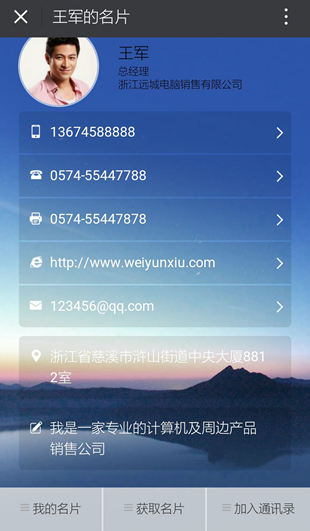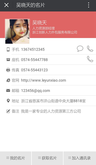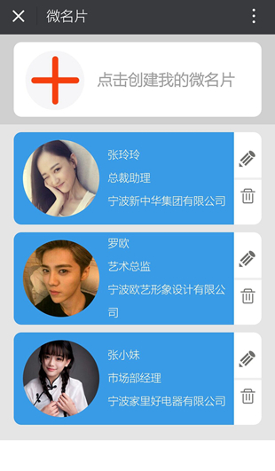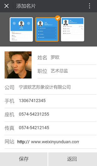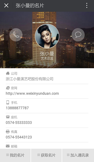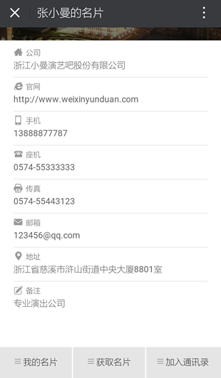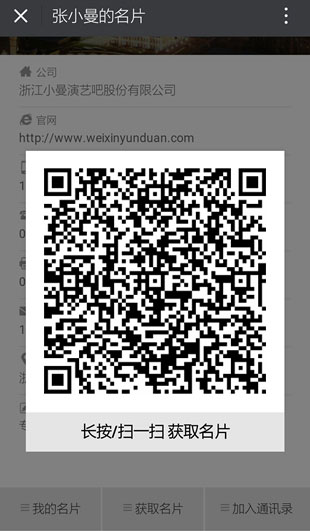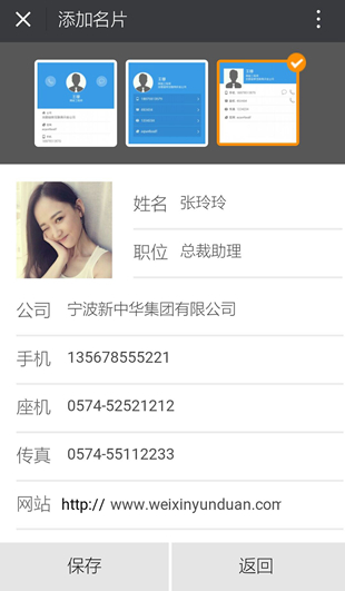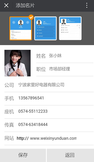 高级名片功能是目前微信中非常流行的企业单位及个人名片应用,企业可以在后台无限添加企业员工微信名片,支持生成独立的名片二维码,同时也支持在手机端由任意粉丝添加自己的微信名片,同样可以生成独立的个人名片二维码,而且粉丝在手机端添加的名片可以在后台被调用出来。让您的企业和粉丝个人名片更具有传播性且更新颖。