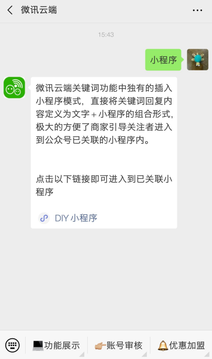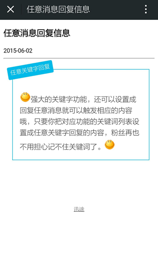 关键字功能可以实现公众平台中的关键字回复信息的功能,公众号可以预先设置一批关键词,用于粉丝回复公众号,即可得到这些预设的推送信息。而关键字所回复的内容可能设定为文本内容、单图文内容、文本+小程序组合内容。特别是直接可以插入已被公众号关联的小程序,极大的方便公众号用于引导粉丝进入小程序。