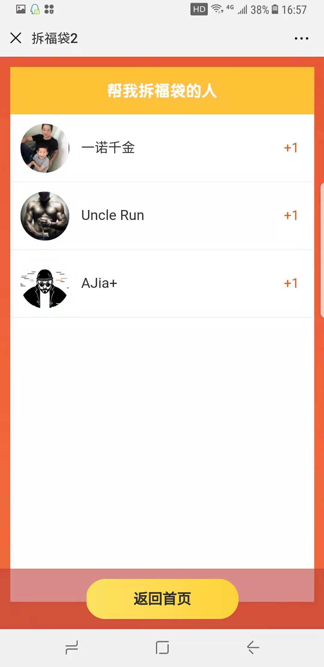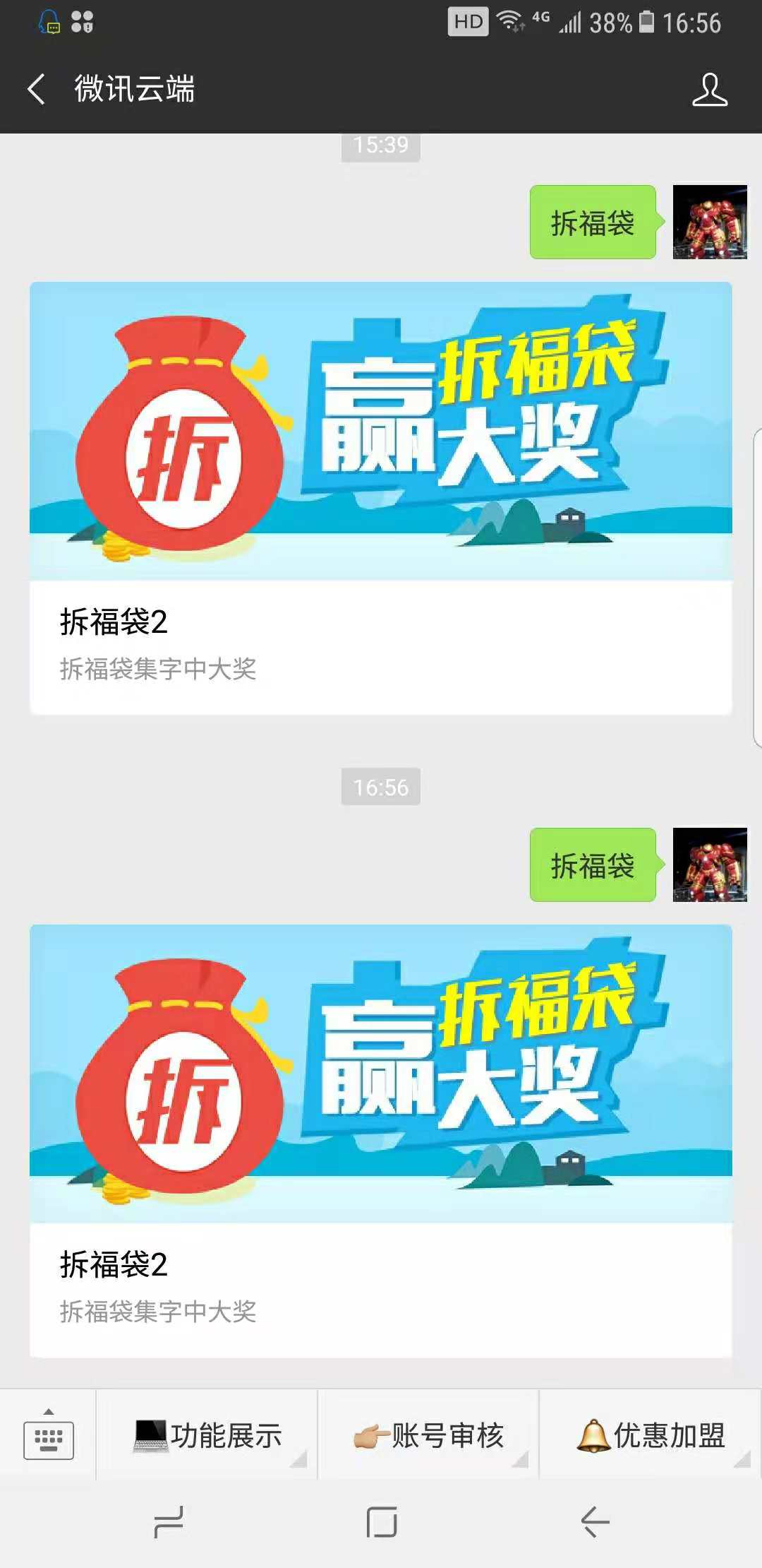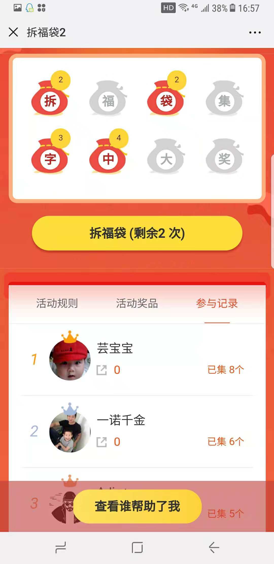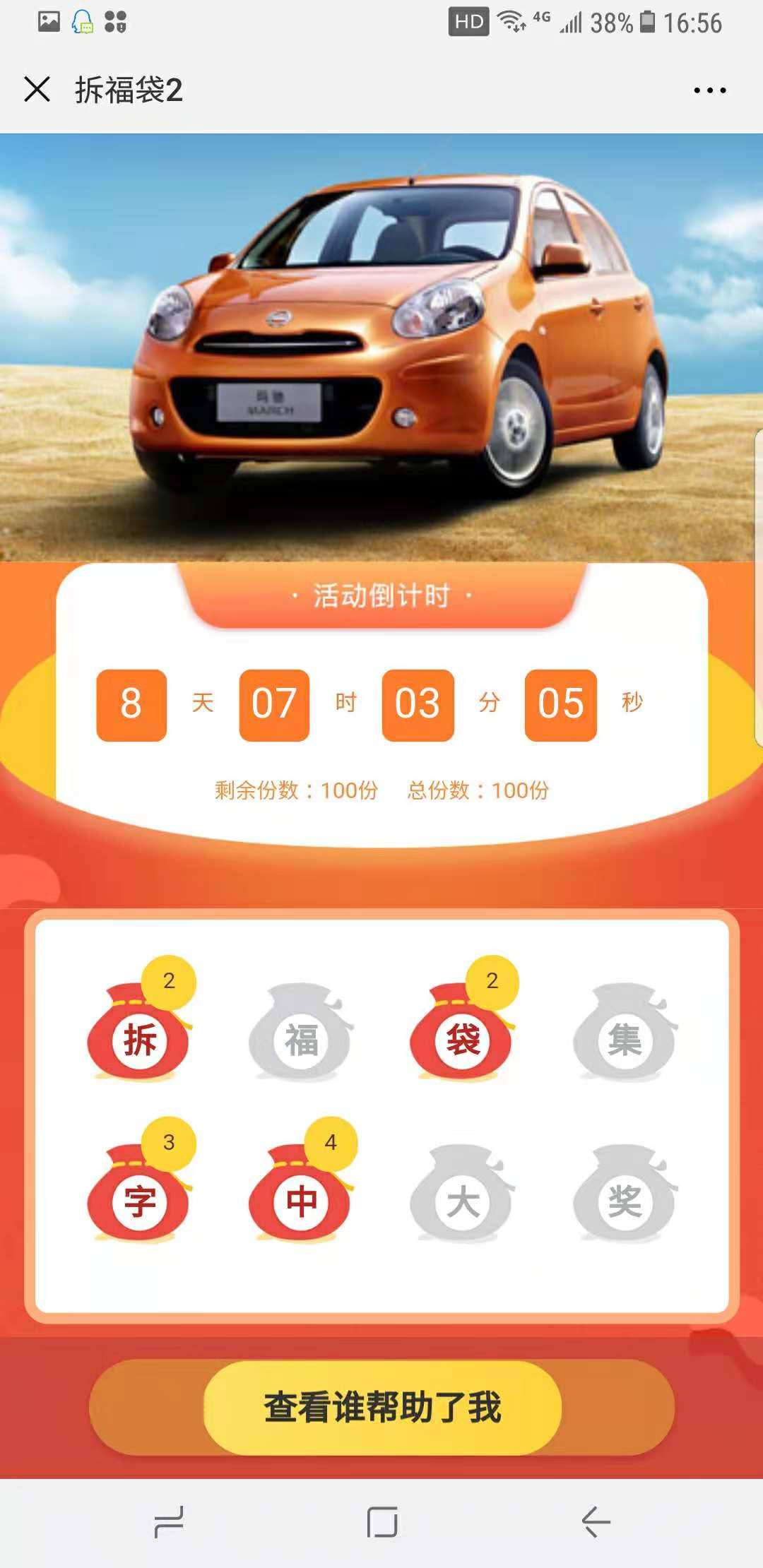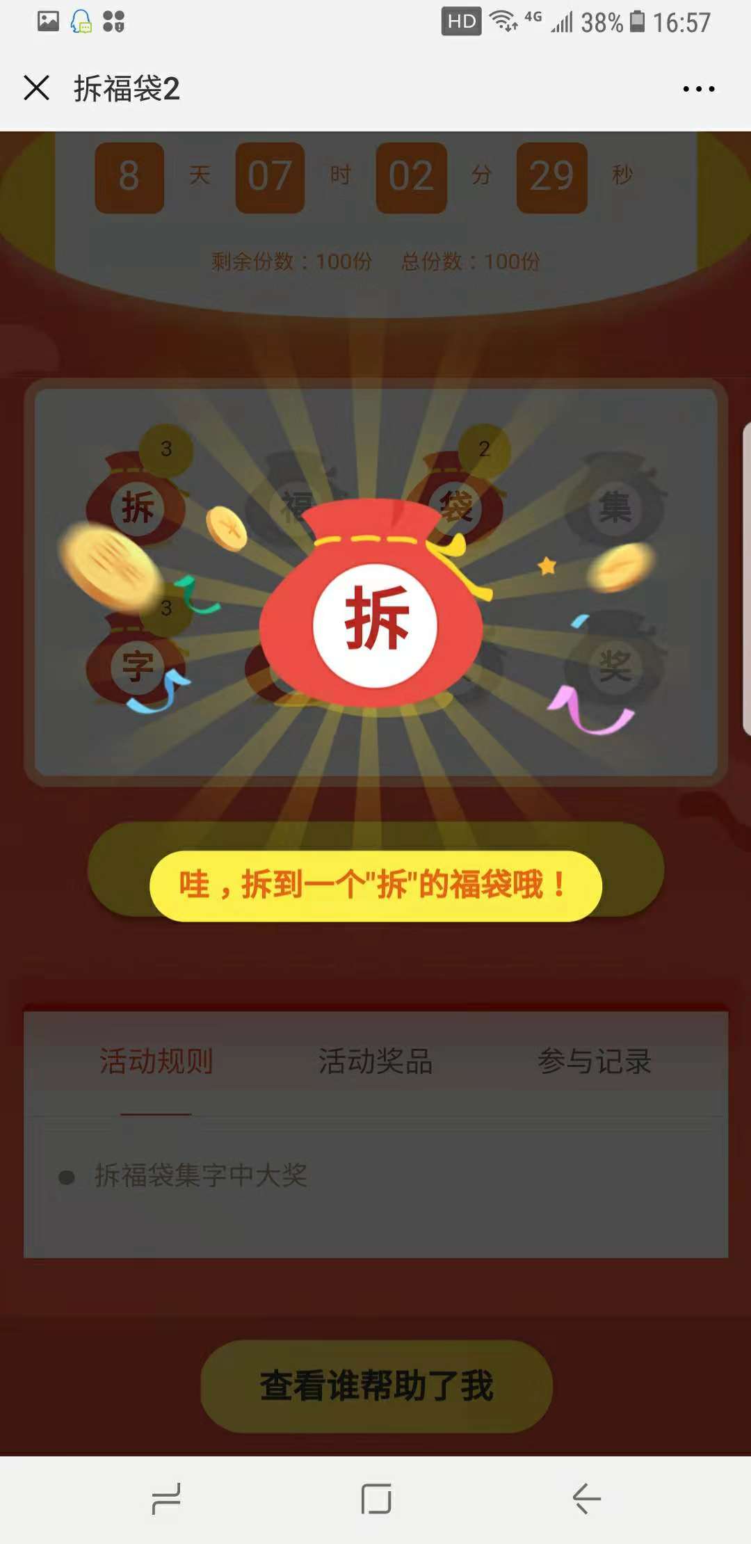 在拆福袋游戏中,需要收集的文字(4~8个字)设置为门店名称、宣传口号等等。用户通过自己本身的集字次数+好友助力次数来收集文字。集齐后,即可拆开福袋,获得商家所设奖品。