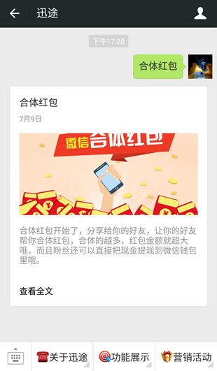 红包功能多用于节日、店庆、特殊日期、购物节等等。在加上商家的红包奖励驱动,粉丝的参与和分享动力瞬间被觉醒。借助节日气氛,商家的活动被大量转发、火爆传播,商家品牌传遍每一个角落,公众号也顺势获得曝光的机会。