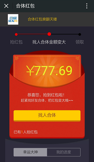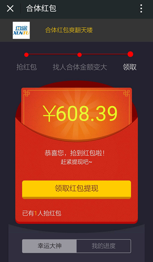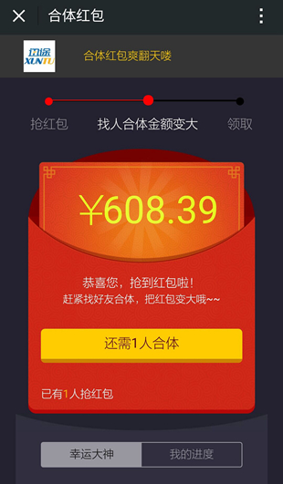公众号商家可以设置红包总金额,以及合体红包的人数要求。当参与领取红包的人数达到商家所设置的合体人数要求后。此红包总金额将会被所有参与合体红包活动的粉丝所瓜分。单个粉丝所获得的红包金额依据红包随机金额范围值而随机发放。红包领取类型为两种,分别为直接领取到微信钱包中,也可以直接充值到会员卡余额中。同时功能可以设置要求微信用户关注公众号之后才可以参与领取红包,以此达到公众号粉丝增长引流之作用。
