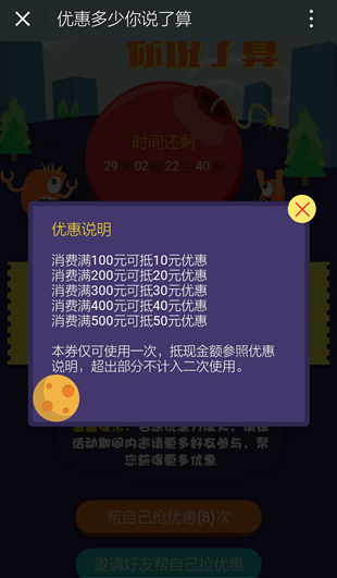 疯狂优惠接力游戏正式上线,手有多快就有多少优惠,真金白银实战优惠促销类功能,不仅自己可以获取优惠额度,同时也可以请求好友帮助你获得优惠额度,可以快速增加粉丝数量以及活动传播。