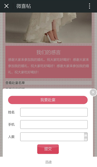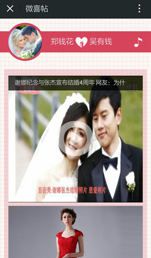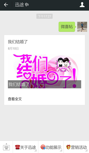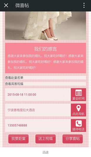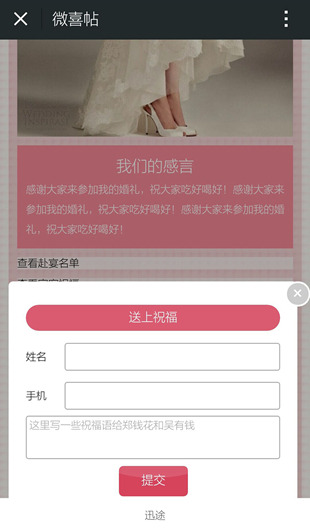 微喜帖可以在公众号内实现电子喜帖的功能,新人可以通过公众号创建自己的电子喜帖并发送给亲朋好友参加喜宴,同时被邀请人可以在微喜帖内留下对新郎新好美好的祝福,也可以留下赴宴的人数信息,新人也可以通过微喜帖在线查看赴宴人数以及好友送上的祝福语。