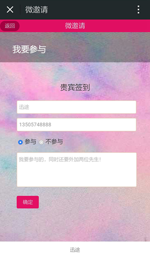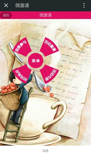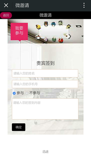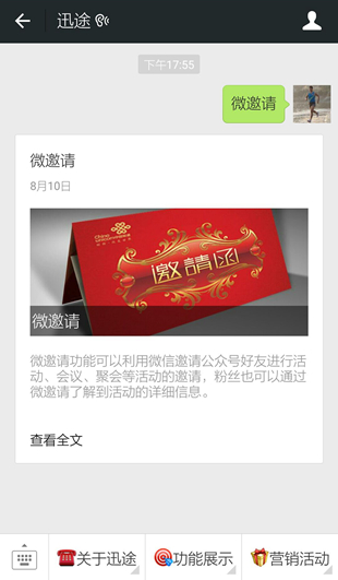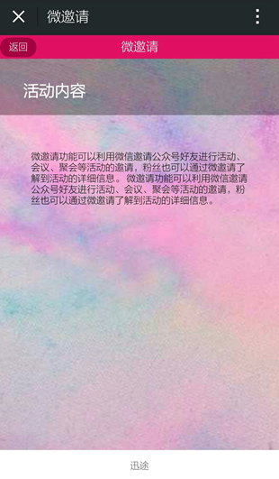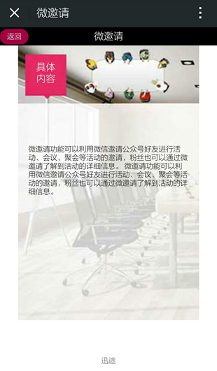 微邀请可以实现会议、活动、聚会等形式的电子邀请函,公众号粉丝可以在线查看活动的时间、地点、内容等信息,也可以在线提交是否参与活动报名。