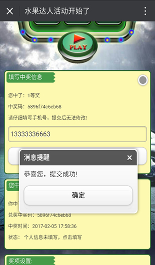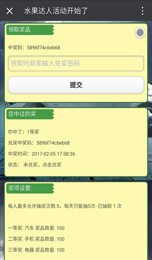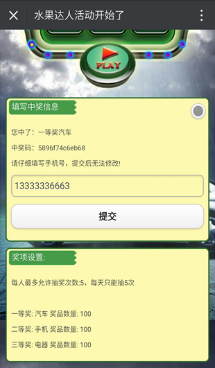 水果机功能支持自定义上传活动背景图片,支持最多添加六个奖项设置,支持设置每人总的抽奖次数,支持设置每人每天的抽奖次数,支持设置每人最多中奖次数,同时还支持商家自定义上传中奖码编号等。