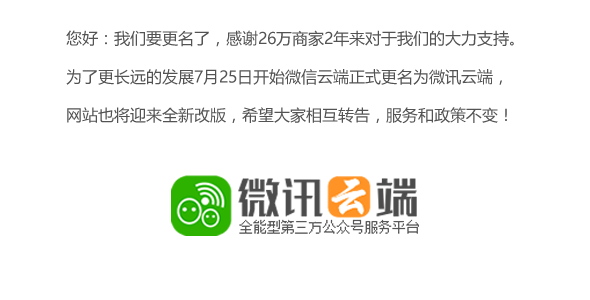 感谢26万商家用户2年的支持和鼓励,为了更好的发展,“微信云端”将正式更名为软盈,服务和政策不变,你在我在,一如既往,初心依旧!