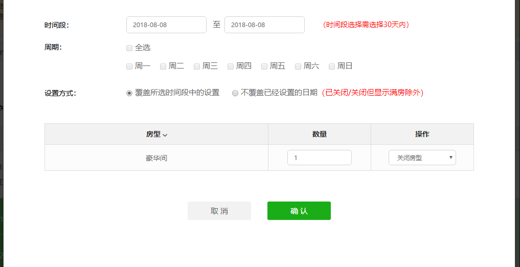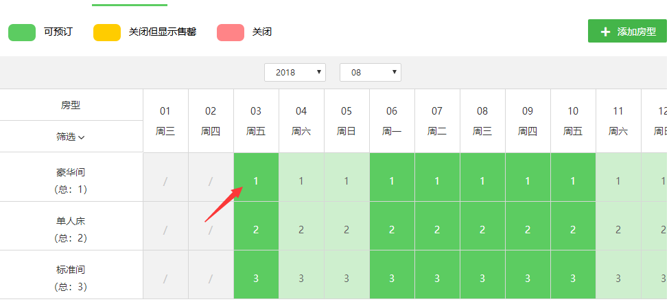 新的房控中心实现了可视化直观管理各时间段的房间使用情况,以色块形式区分不同房间使用情况,更可以直接点击该色块进行单个以及批量编辑该房型每周的使用情况,精确到天。