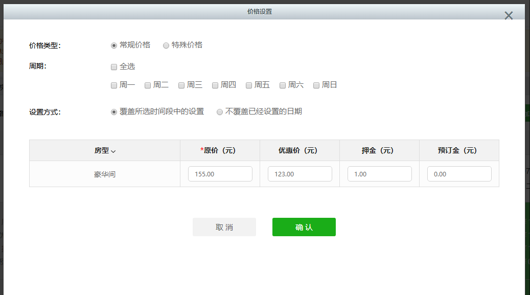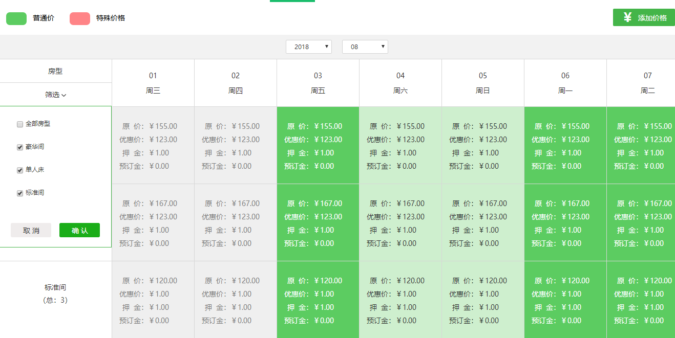 新的价格管理也同样实现了可视化色块化批量管控,更加直观和一眼就能区分房间使用情况,相比之前的管理更加得心应手一目了然。