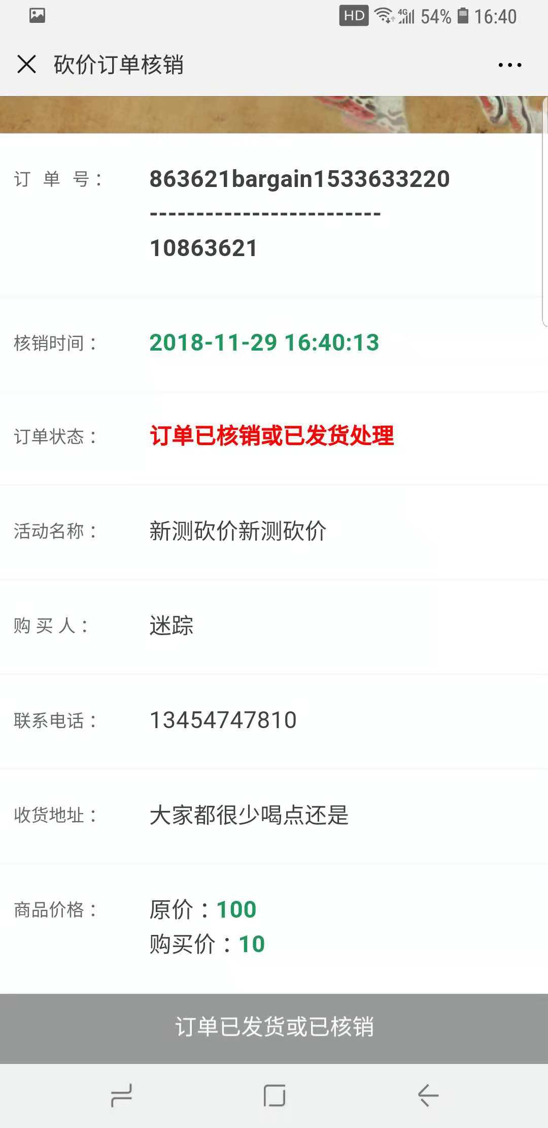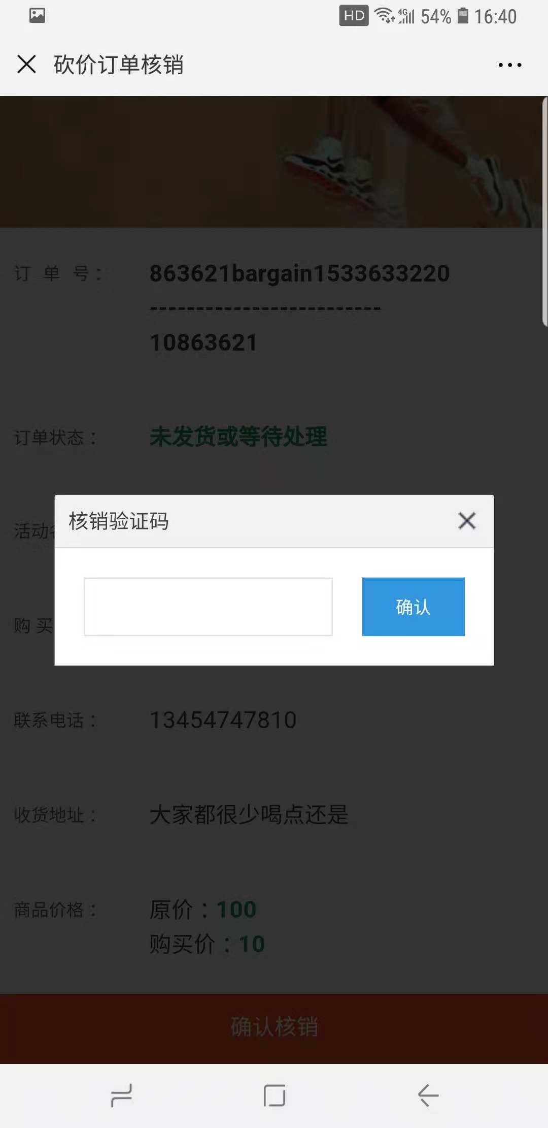 每个砍价活动都可以设置独立的扫码核销订单的操作密码,用户手机端在砍价界面点击“个人中心”进入“我的订单”页面后,里面有当前用户参与的所有砍价活动订单,每个订单系统自动会生成一个核销二维码,点击右侧二维码小图标后会弹出完整的二维码图片,店家只要在用户手机上长按扫码打开核销页面,又或者使用店员自己的手机扫描用户出示的这个核销二维码后,会自动进入该砍价订单的核销界面,核销界面上会有详细的用户信息和订单信息,核对订单信息无误后店家可以直接点击下方的核销订单按钮,在弹出的核销密码验证界面输入核销密码即可直接核销这笔订单,当场给予用户商品或者奖励后该砍价交易就此结束!
