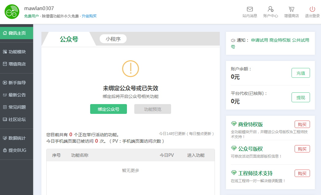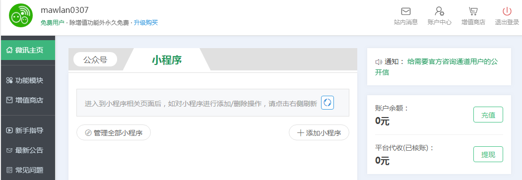 重点新增了直接对接到微讯小程序平台的小程序绑定入口,不再需要在软盈和微讯小程序这两个平台重复登录操作,下面就新版的管理面板UI进行简单展示说明。
