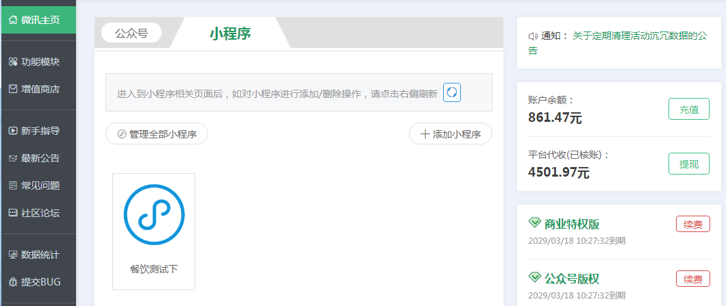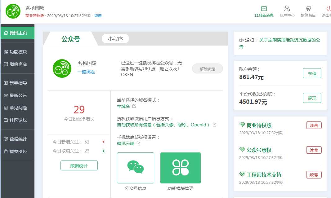 近期对账号后台的管理面板进行了全新的UI设计,优化了许多公众号与小程序绑定的操作流程,同时也新增了公众号功能的数据统计项目,细化和简便了公众号的绑定操作方式,使得更多的公众号用户能够快速的上手运营。