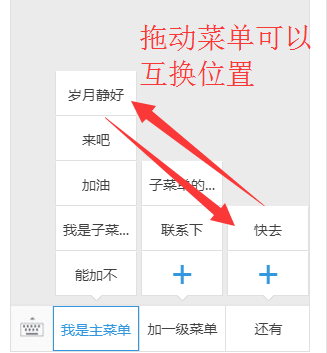 相比之前的自定义菜单版本,全新上线的自定义菜单功能在编辑方式上有了重大的改变,主要特点首先是支持所见即所得的方式,用户在添加完菜单后可以实时看到自定义菜单的展示效果。还增加了一个核心特点是即完全支持菜单位置的互换,支持直接通过鼠标拖动菜单进行显示位置的变动,还支持整组菜单位置的互换排序变动。