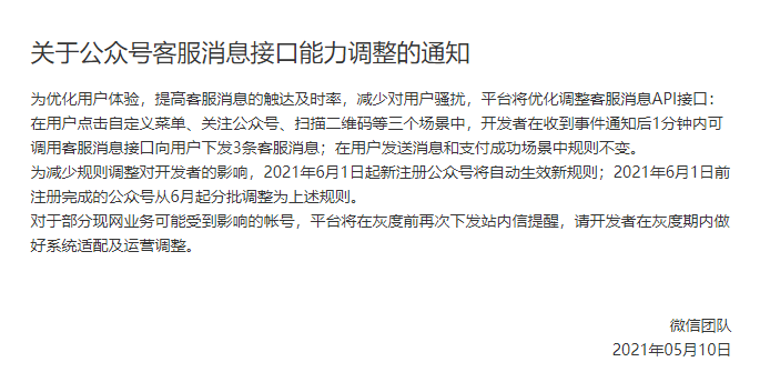 如果您的公众号正在使用其他第三方平台上的客服消息群发之类的功能,请马上作出调整,微信官方将在6月起陆续调整这个接口了,请广大用户朋友悉知了解。