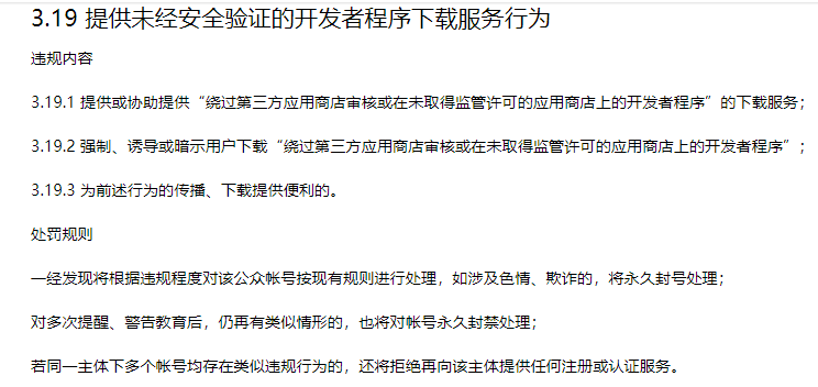 附微信公众平台管理条款:3.19 提供未经安全验证的开发者程序下载服务行为