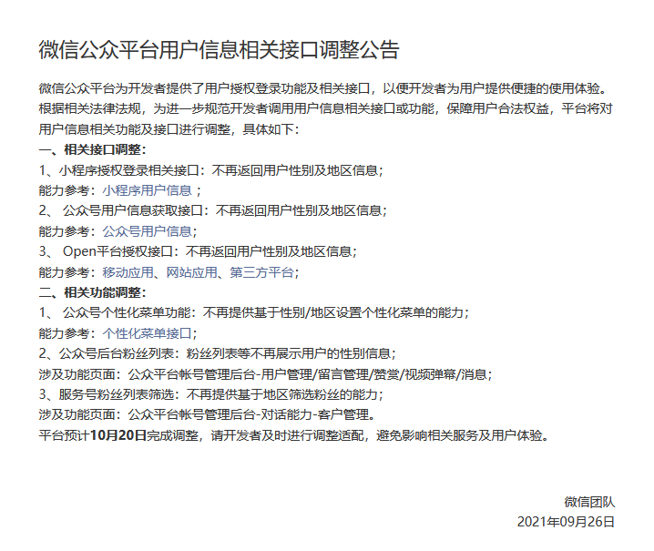 微信平台预计将在10月20日之前完成相关接口权限的调整,请广大公众号用户注意,以上相关用户信息将不再提供和展示,以免影响相关使用体验。