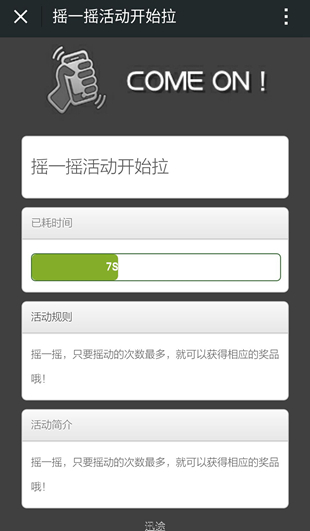 摇一摇功能可以通过公众号实现现场粉丝互动,通过粉丝摇动手机来实现大屏幕上的活动排名。摇一摇属于现场互动模块,摇一摇已经集成到微现场功能内,只能通过微现场功能发起现场摇一摇互动,由于摇一摇需要微现场功能大屏幕配合使用,可能您无法真实体验摇一摇现场感受。