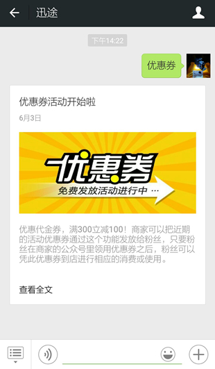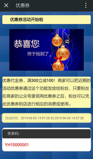 优惠券功能可以代替传统纸质优惠券,公众号粉丝领取优惠券之后,到店向商家出示公众号内的优惠券即可,方便又环保。