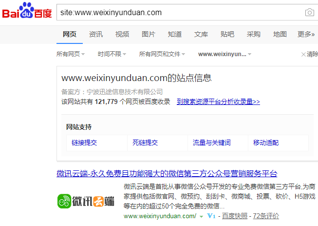 等功能?直接通过百度搜索就可以知道了,比如想了解软盈,那直接在百度搜索框内搜索这条代码:site:www.weixinyunduan.com,就可以看到百度的结果了。如果想搜索查看其它平台有多少人在使用图文页面或微信网站页面,直接把把域名换在其他平台的就可以了,完整的搜索代码是这样的(site:www.******.com)。