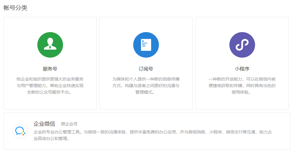 由此我们可以得出结论,当前有四种类型的官方帐户,即:订阅号,身份验证订阅号,服务号和身份验证服务号。